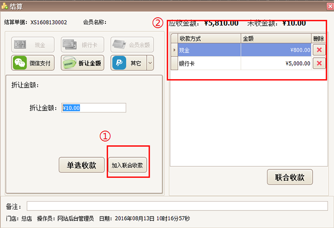 加入联合收款:如现金收800元、银行卡收5000元、折让10元、选择上方“支付方式” ,点击“加入联合收款”