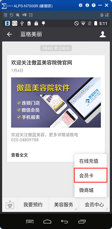傲蓝美容院微信会员系统结合美容院公众号的前台具体的操作步骤如下: