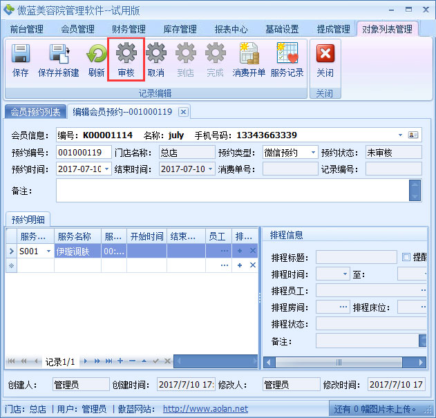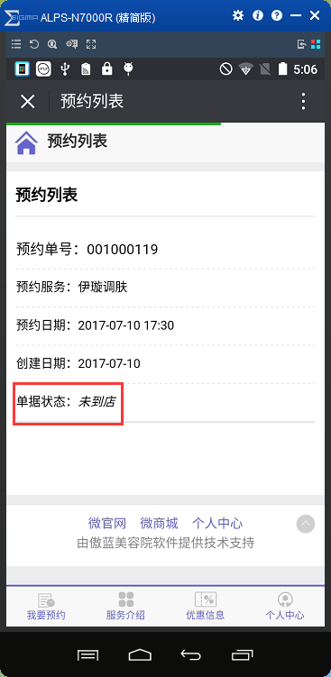 ②会员在微信公众号预约之后,美容院的工作人员可在门店的傲蓝美容院微信会员系统中根据预约提醒,进入预约列表,根据会员在预约单进行合理的工作安排,如图: