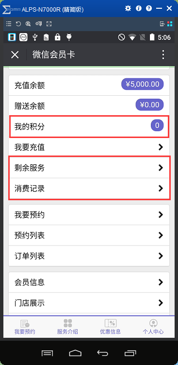 4、傲蓝美容院微信会员系统,会员可通过微信公众号了解自己的消费情况,点击【会员中心】→【会员卡】查看使用前后的积分情况,“剩余服务”查看自己未完成的套餐服务,“消费记录”查看自己在美容院的消息消费情况,消费透明化提升美容院的信誉度,如图: