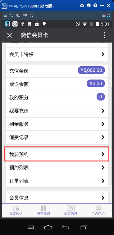 3、傲蓝美容院微信会员系统微信公众号预约功能,会员可在美容院微信公众号的【会员中心】→【会员卡】界面进行服务预约,选择“我要预约”或者在微信公众号的首页,点击【我要预约】如图: